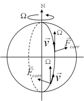 \vec F_{cor} = -2m\vec \Omega\times \vec v.