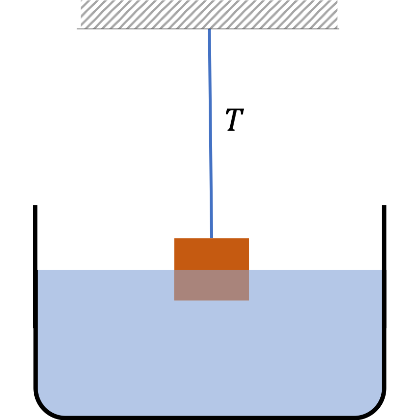 We tie a block of a material of density higher than the density of water to a thin thread and measure the tension in the thread as the block is lowered in water. When the block is in air, the tension is \(50\text{ N} \) and when fully submerged, the tension is \(40\text{ N} \text{.}\) What is the density of the material if the density of water is \(1000\text{ kg/m}^3\text{.}\)