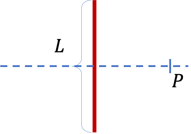 \phi_P \amp = \dfrac{\lambda}{4\pi\epsilon_0}\, \int_{-L/2}^{L/2} \dfrac{dy}{\sqrt{x^2 + y^2}} \\