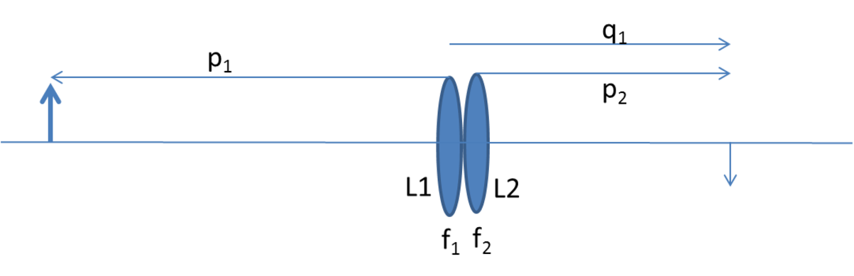 The figure shows the physical situation. We will work out the image distance due to the first lens L\(_1\) and then use that intermediate image as a virtual object for the second lens L\(_2\text{.}\)